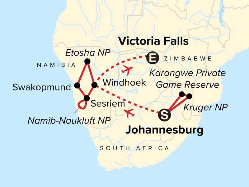 Your Discover Moment: Swakopmund. Arrival transfer. Panorama Route scenic drive with entrances. Kruger National Park and private nature reserve wildlife safari drives in open vehicles. Sossusvlei desert excursion. Desert excursion with a local. Sandwich Harbour & Skeleton Coast Excursion. Full-day open-vehicle wildlife safari drive in Etosha. Tour of Victoria Falls. Internal flights. All transport between destinations and to/from included activities
