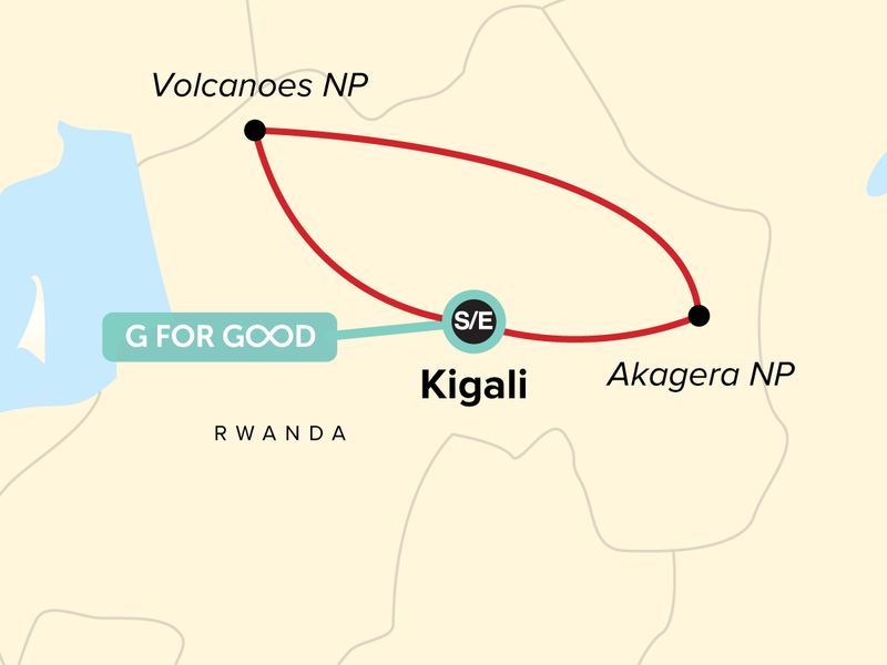 Your G for Good Moment: Nyamirambo Women's Centre, Local Lunch, Kigali. Arrival & departure transfer. All national park entrance fees. Genocide memorial entrance. Mountain gorilla trek with permits. Golden monkey trek with permits. Local village walk. Safari drives in Akagera National Park. Wildlife boat cruise on Lake Ihema. All transport between destinations and to/from included activities