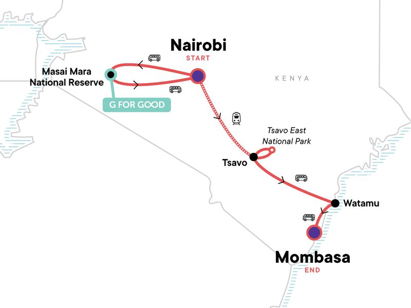 Your Welcome Moment: Welcome Moment - Meet Your CEO and Group. Three safari drives in Tsavo East NP. Historic Town and Archaeological Site of Gedi visit. Cooking class in Watamu. Free time in Tsavo and Watamu. Masai Mara National Reserve entrance and wildlife safari drives. Masai Village Visit. All transport between destinations and to/from included activities