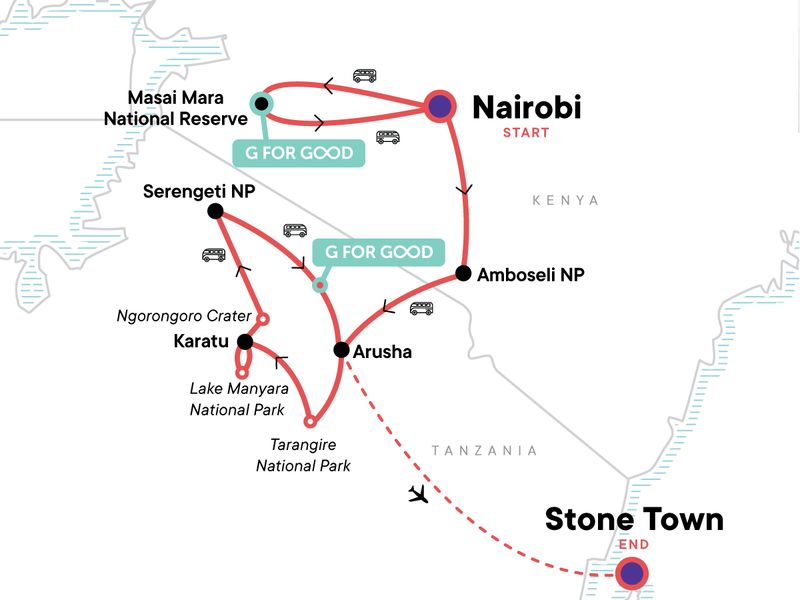 Your Welcome Moment: Welcome Moment - Meet Your CEO and Group. Masai Mara National Reserve entrance and wildlife safari drives. Masai Village Visit. Safari drive in Amboseli National Park. Two safari drives in Tarangire National Park. Coffee harvesting tour in Karatu. Scenic safari drive in Ngorongoro Crater. Sunset safari drive in Serengeti. Full-day safari drive in Karatu and Serengeti National Park. Stonetown Orientation Walk. Spice Tour Zanzibar. Free time in Tsavo, Serengeti National Park, and Zanzibar. Internal Flight to Zanzibar. All transport between destinations and to/from included activities.