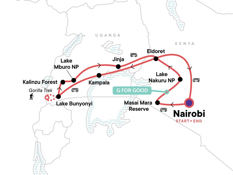 Your Discover Moment: Jinja. Wildlife safari drives in Masai Mara National Reserve. Safari in Lake Nakuru National Park. Guided mountain gorilla trek in Bwindi with permits. Entrance and chimpanzee tracking in Kalinzu Forest Reserve. Tea plantation visit. Transfer from Jinja to Nairobi. All transport between destinations and to/from included activities.