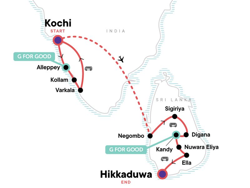 Your Big Night Out Moment: Hikkaduwa Beach Bar, Hikkaduwa. Guided Kerala boat tour and homestay. Morning ferry cruise on Kollam's backwaters. Neendakara Fishing Harbour visit. Orientation walks in Kochi, and Kollam. Internal flight. Sri Lankan lunch at a local village. Spice garden visit. Tea plantation tour. Little Adam's Peak Tour. Galle Fort tour. All transport between destinations and to/from included activities.