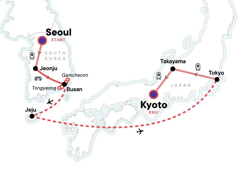 Visit HiKR Ground in Seoul, Take in colorful Gamcheon village on a walking tour, Watch the Haenyeo of Jeju Island, Explore lively Tokyo, spend a night in a traditional Minshuku (japanese inn), travel to culturally-rich Kyoto