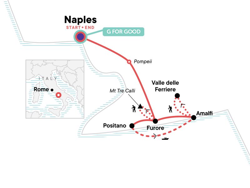 Live at an agriturismo on the Amalfi Coast for a week, Hike beautiful trails including the famous "Path of the Gods", Explore chic resort towns and historic villages, Savour delicious home-cooked Italian food made from local ingredients, Take in spectacular views of the Amalfi Coast from the water on a scenic ferry ride between Positano and Amalfi
