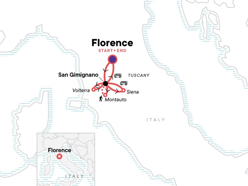 Your Local Living Moment: Local Wine Tasting, San Gimignano. Orientation walk Florence. Welcome briefing with local host. Dinner at Ugo's. Cooking class in San Gimignano. Orientation walk San Gimignano. Orientation walk Volterra. Alabaster workshop tour and demonstration. Hike through the Tuscan Countryside. Free time to explore Siena. All transport between destinations and to/from included activities.