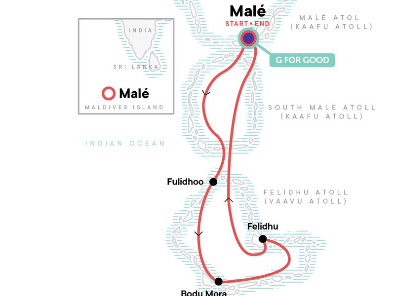 Your G for Good Moment: Maldives Plastic Clean Up. Arrival transfer. Fulidhoo Island visit and Bodu Beru performance. Felidhu Island visit. Bodu Mora Island visit. Snorkelling equipment. Beach time in the Maldives. Seven days aboard a traditional dhoni boat.