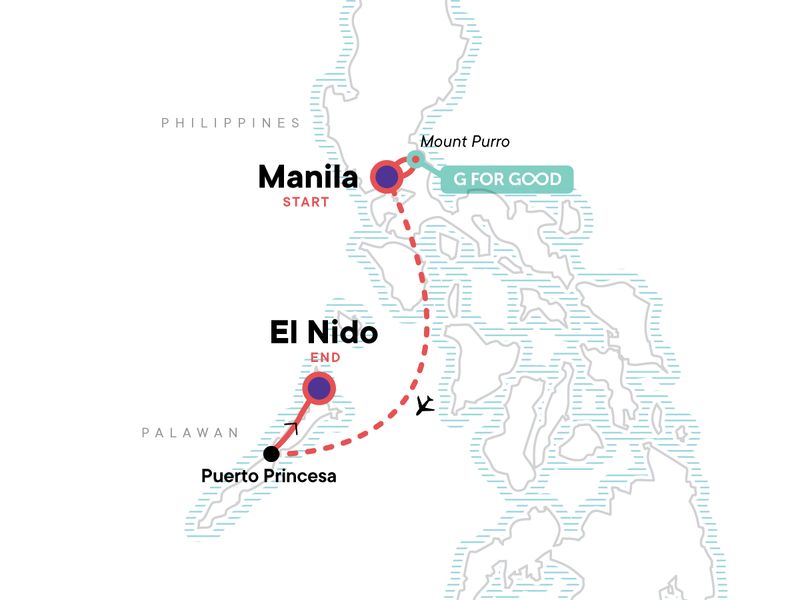 Your Welcome Moment: Welcome Moment - Meet Your CEO and Group. Mount Purro Nature Reserve overnight visit. Hike to and swim at a waterfall. Share stories around the bonfire. Indigenous Community-led Cooking Class. Mount Purro sunrise hike. Free time in Manila. Chinatown foodie tour. Manila Jeepney ride. Puerto Princesa Subterranean River tour. Full day El Nido island hopping boat excursion. Free time in El Nido. Free time in Puerto Princesa. All transport to and from included activities.