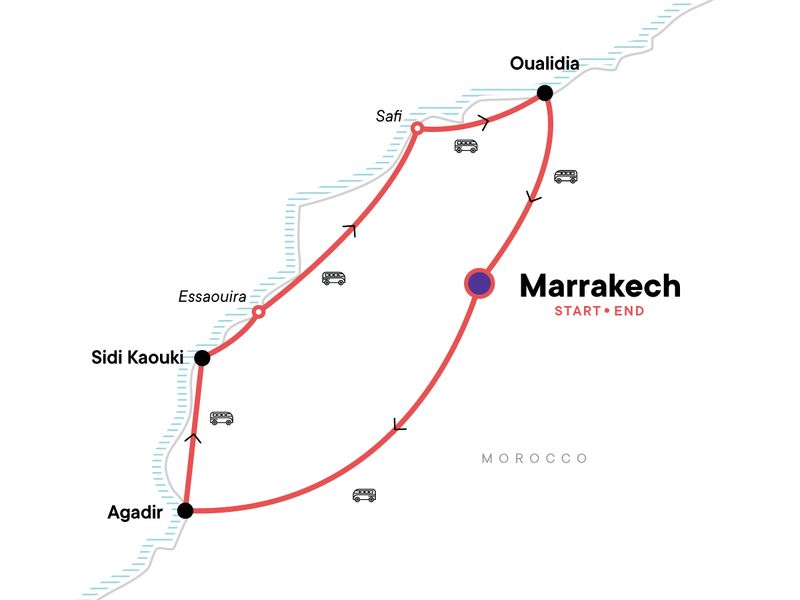 Your Foodie Moment: Local Lunch and Traditional Cooking Demonstration, Sidi Kaouki. Visit to the Souk Lhad market. Tamri Beach Sandboarding. Bread making and lunch with a local family. Visit to Essaouira. A stop at Safi old town and pottery market. Free time in Oualidia. All transport between destinations and to/from included activities.