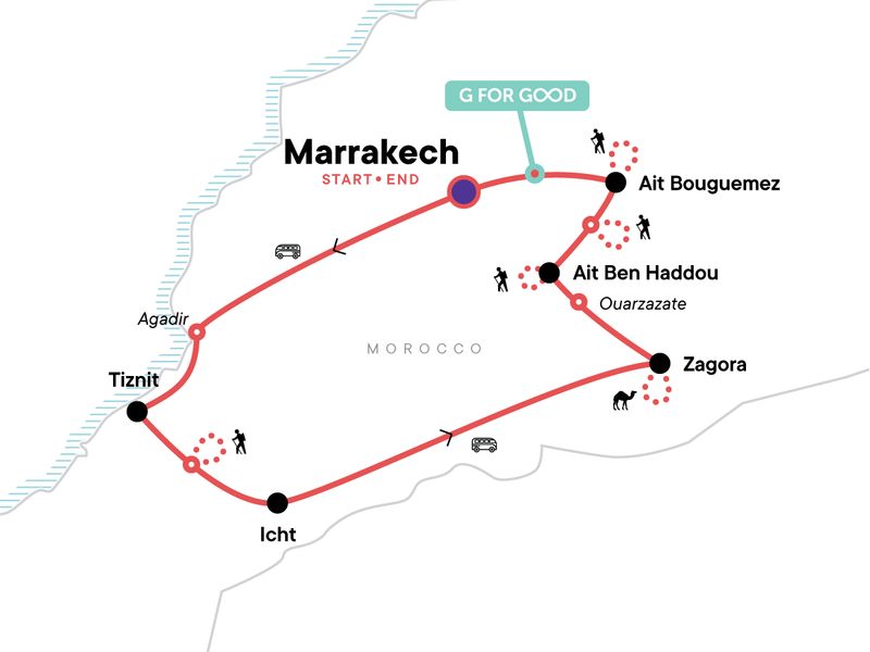 Your Foodie Moment: Cooking Demonstration and Lunch, Zagora. Souk El Had Visit. Tiznit Silver Market Visit. Hike outside of Icht. Icht Locally Guided Underground Village Visit. Zagora Desert Stay Experience with Camel Ride. Aït Ben Haddou Kasbah Tour. Iminifri Natural Bridge Hike. Aït Bouguemez Valley Hike & Granaries Visit. All transport between destinations and to/from included activities.