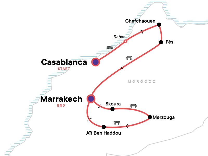 Your Big Night Out Moment: Marrakech. Enjoy free time in Rabat. Explore the blue city of Chefchaouen. Visit the medina and souks of Fès. Dades Gorge walk. Sand boarding in the desert dunes. Guided medina visit in Marrakech. Sunset camel ride in the desert. Traditional dinner and drums under the stars. Aït Ben Haddou kasbah tour. All transport between destinations and to/from included activities.
