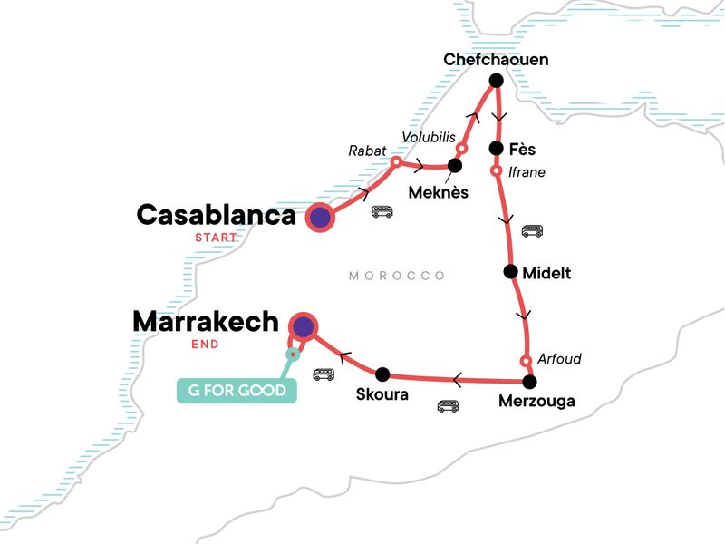 Your Foodie Moment: Lunch with a Local Family Midelt, Midelt. Visit to Hassan II Mosque. City visit of Rabat. Meknes medina walking tour. Volubilis guided visit. CEO-led walk of Chefchaouen. Guided tour of Fes medina. Lunch inside a traditional Riad. Stop in Ifrane for tea. Learn about the art of Henna from local women. Hike through Berber Villages in the foothills of the Atlas Mountains. Visit the town of Arfoud and learn about the production of dates. Ride on camels to the desert camp. Watch sunset atop a sand dune. Enjoy a Berber dance performance and dinner by firelight. 4x4 ride through Erg Chebbi's dunes. Medfouna cooking class in Taous village. Guided city tour to the Valley of One Thousand Kasbahs. Ait Ben Haddou visit. Cross Tishka pass en route to Marrakech. Optional CEO-led walk of Marrakech’s city centre. City tour with Bahia Palace, the Ben Youssef Madrasa, Koutoubia Mosque, and Marrakech medina.. All transport between destinations and to/from included activities