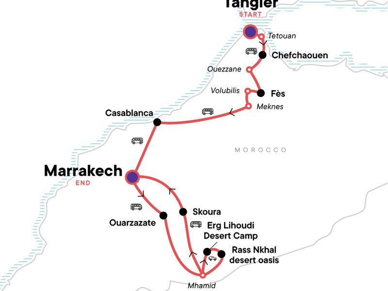 Your Local Living Moment: Rif Mountain Hike & Goat Cheese Making, Chefchaouen. Orientation walk of the old town of Tangier. Tétouan city visit. Chefchaouen orientation walk. Ouazzane city visit. Guided visit to the Fés Medina. Tour of Volubulis. Meknes visit. Full-day Casablanca tour. Free time in Fés. Film Studio visit in Ouarzazate. Welcome Tea and bonfire at Erg Lihoudi desert camp. A camel ride and 4x4 jeep excursion to desert oasis camp. Cooking class in Marrakech. Food tasting in the medina. Tea on terrace overlooking Jemaa El Fnaa. Visit to Jardin Secret and Bahia Palace. Local bakery stop for some moroccan bread. Tanjia pots lunch. Visit to Ouzoud, an oasis waterfall. Farewell Dinner in Jamaa Fnaa Square food stall. Free time in Marrakech. All transport between destinations and to/from included activities.