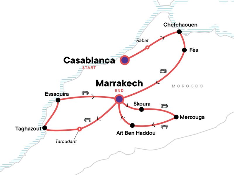 Your Big Night Out Moment: Marrakech. Enjoy free time in Rabat. Explore the blue city of Chefchaouen. Visit the medina and souks of Fès. Dades Gorge walk. Sand boarding in the desert dunes. Guided medina visit in Marrakech. Sunset camel ride in the desert. Traditional dinner and drums under the stars. Aït Ben Haddou Kasbah tour. Surf lesson in Taghazout. Sunset beach bonfire. Essaouira orientation walk. All transport between destinations and to/from included activities.