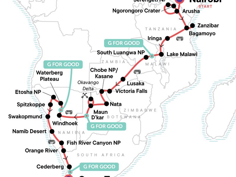 Swim in the turquoise waters of Zanzibar, Look for the “big five” across Africa, Stand in the spray of Victoria Falls, Catch a sunset at the Fish River Canyon, Camp along the rim of the Ngorongoro Crater, Meet Naro San people on the fringes of the Kalahari Desert, Explore cosmopolitan Cape Town