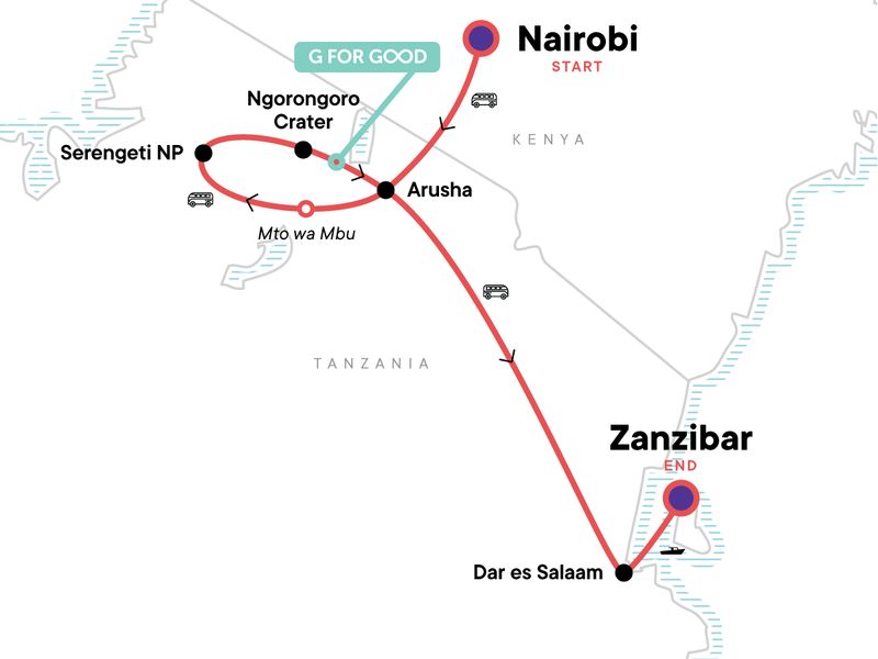 Your First Night Out Moment: Connect With New Friends. Transfer from Nairobi to Arusha. Entrances and wildlife safari drives in Serengeti National Park and in Ngorongoro Crater. Ferry to Zanzibar. Stone Town orientation walk. Beach time in Zanzibar. All transport between destinations and to/from included activities.
