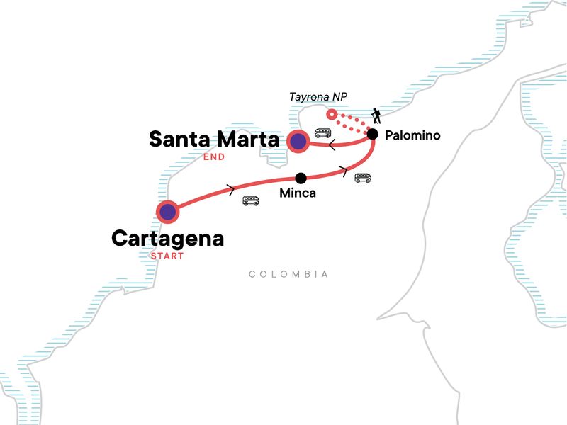Your Big Night Out Moment: Santa Marta. CEO-led orientation walk in old town Cartagena. Walk to the Marinka Waterfalls outside of Minca. Tayrona National Park visit and moderate hike. Palomino beach bonfire. CEO-led orientation walk in Santa Marta. Free time for optional activities in Cartagena, Minca, Palomino, and Santa Marta. Transport between destinations and to/from included activities.