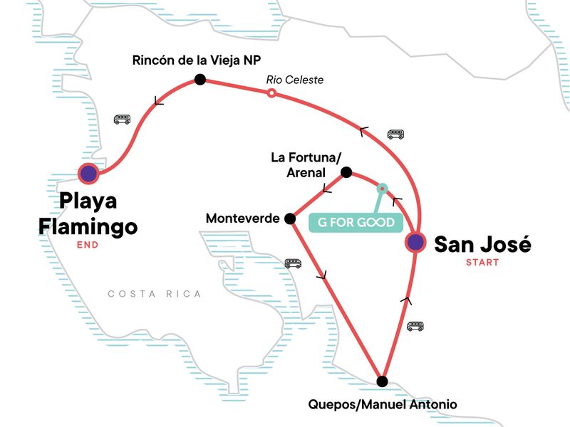 Beloved by all travellers, Costa Rica is a small but mighty gem — and this 14-day adventure from San José to Playa Flamingo shows you why. You'll hit the highlights while veering off the beaten path to uncover local favourites. Soar through the jungle canopy of Monteverde, feel the spray of a waterfall in Manuel Antonio National Park, and marvel at the electric blue waters of Rio Celeste. With visits to three national parks, the gorgeous beaches of Guanacaste, and peaceful rainforest retreats, this trip strikes the perfect balance between adventure and relaxation. Costa Rica like never before!
