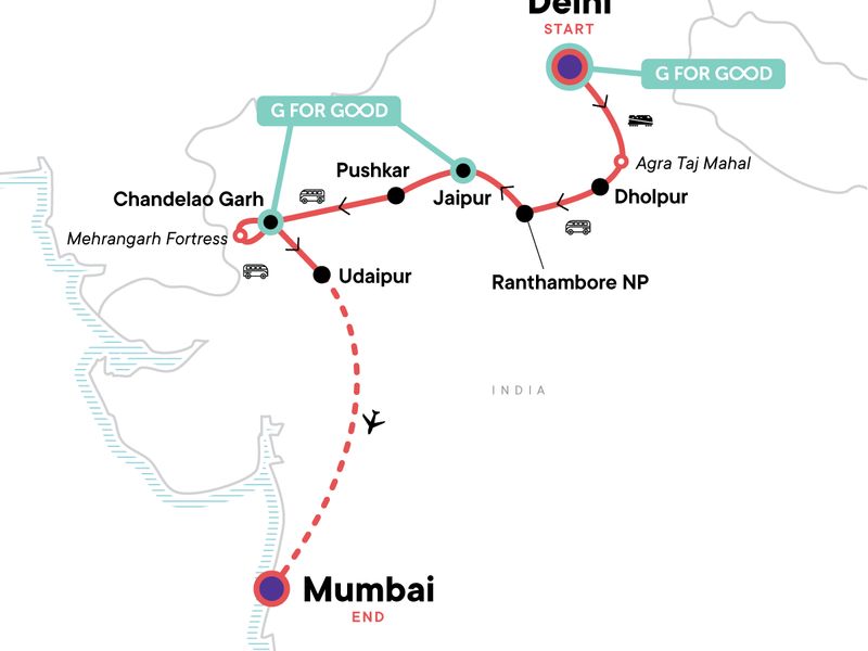Your OMG Day: Yoga Class or Savitri Temple Hill Walk, Pushkar. Welcome and Farewell Dinners. Namaste Delhi Walking Tour. Old Delhi Walking Tour with Stops at the Jama Masjid. Agra Fort Visit. Taj Mahal Guided Tour. Chambal River Safari. Dholpur Cycling Tour. Safari in Ranthambore National Park. Jaipur Orientation walk. Hawa Mahal Visit. Amber Heritage Walk and Panna Meena Stepwell. Visit Amber Fort. Jantar Mantar Observatory Guided Tour. Pushkar Holy Town Walk with Brahma Temple. Kalbeliya Traditional Dancing Demonstration. Changelao Garh Orientation Walk. Sunder Rang Cooperative Visit. Mehrangarh Fortress. Ranakpur Jain Temples. Udaipur Prientation Walk. Badi Lake Cycle. Jagdish Temple Visit. Lake Pichola Sunset Boat Ride. Elephanta Island and Caves Excursion. All tips included for activities and meals, except for CEO and porterage. All transport between destinations and to/from included activities