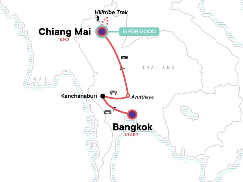 Your Welcome Moment: Welcome Moment - Meet Your CEO and Group. Klong riverboat tour (Bangkok). Wat Po visit. Erawan Falls and Bridge on the River Kwai visit. Thai Burma Railway Centre and Allied War Cemetery visit (Kanchanaburi). Temple ruins tour (Ayutthaya). Thai Burma Railway Centre visit. Doi Suthep temple visit (Chiang Mai). Trek to remote hilltribe villages (3 days). Lod Cave visit and bamboo rafting. All transport between destinations and to/from included activities.