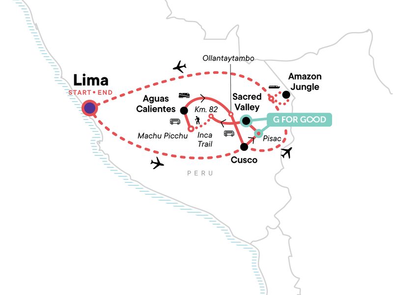 Your Foodie Moment: Dinner at Huaca Pucllana, Lima. Complimentary arrival transfer. Welcome dinner. Explore Miraflores and Barranco by bicycle and on foot. CEO-led orientation walk of Cusco's historical centre. Explore the ruins of Pisaq in the Sacred Valley with a local guide. 4-days hiking the Inca Trail with an expert local guide, cooks and porters. Upgraded camping experience with included cots, air mattresses, blankets, portable toilets and warm showers. Included sleeping bags and trekking poles along the hike. Guided tour of Machu Picchu. Lunch at Machu Picchu Sanctuary Lodge. 2 days of excursions to spot wildlife in the Amazon jungle by boat and on foot with a naturalist guide. Rubber boot use. Farewell dinner. Internal flights. All tips included for activities and meals, except for CEO and porterage. All transport between destinations and to/from included activities.