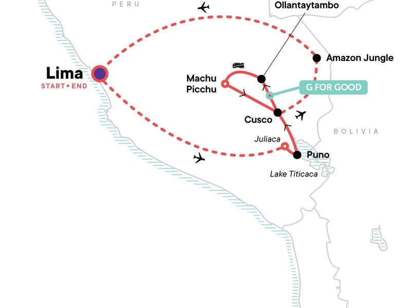 From the depths of the Amazon to the heights of the Andes, this adventure takes you deep into the heart of Peru. Wake up to the calls of howler monkeys at our intimate G Lodge Amazon, spot vibrant macaws in the treetops, and glide past caimans lurking along the riverbanks. Then, shift from jungle to highlands as you sail the shimmering waters of Lake Titicaca, stepping onto floating reed islands where local communities share their traditions. Explore the Sacred Valley’s ancient ruins, then follow in the footsteps of the Incas (literally) as you walk through the legendary Sun Gate to Machu Picchu, where expert guides bring its mysteries to life.