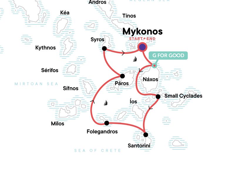 Arrival day. Join the group at 11am for a welcome meeting and safety briefing before beginning the journey through the Cyclades. We highly recommend booking pre-tour accommodation in order to have time to explore the island of Mykonos. You may also have time to explore Mykonos island on the last day of the trip.