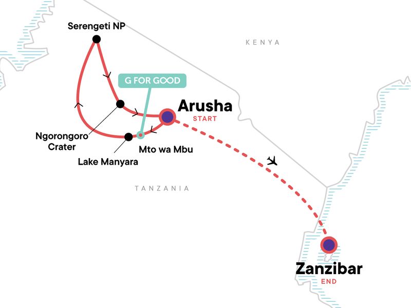 Your Welcome Moment: Welcome Moment - Meet Your CEO and Group. Lake Manyara wildlife safari drive. Serengeti wildlife safari drives. Ngorongoro Crater wildlife safari drive. Flight from Arusha to Zanzibar. Orientation walk in Stone Town. Spice plantation guided tour. all national park fees and entrances are included. All transport between destinations and to/from included activities.