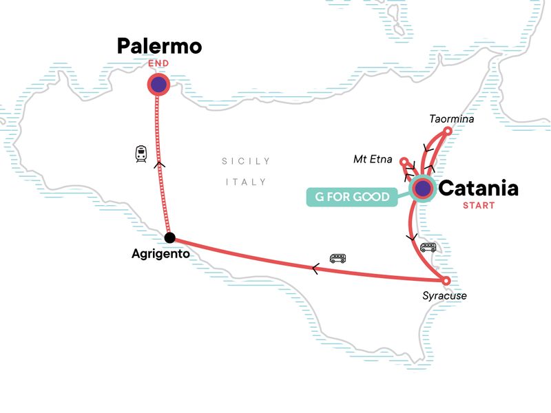 Me Day: Agrigento Me Day, Agrigento. Catania orientation walk and market visit. Aperitivo experience. Walk at Mount Etna to see the Crateri Silvestri. Visit Taormina and the ancient amphitheatre. Syracuse visit. Agrigento orientation walk. Palermo orientation walk. All transport between destinations and to/from included activities.