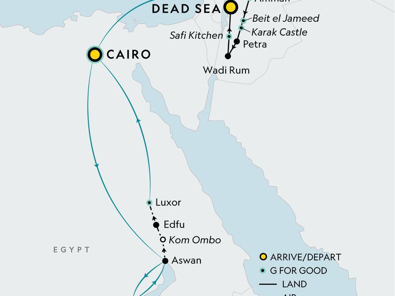 Signature Moment: Wadi Rum Stargazing, Wadi Rum. Arrival transfer. Great Pyramid of Giza and Sphinx Tour. Sakkara Visit. Internal flight from Cairo to Aswan. Philae Temple Visit. Nubian Village Felucca Ride Visit & Tea. 3-night Nile River Cruise from Aswan to Luxor. Internal flight to/from Aswan to Abu Simbel. Temple of Abu Simbel Visit. Kom Ombo Temple & Museum Visit. Private Opening of Edfu Temple. Habu Temple Visit. Hatshepsut Temple Visit. Karnak Temple Visit. Valley of the Kings Visit. The History & Sites of Old Cairo. Evening Rooftop Experience in Cairo. Khan el-Khalili Bazaar Visit & Lunch. Grand Egyptian Museum Visit. Internal flight between Cairo and Amman. Guided tour of Jerash archaeological site. Private post-closure visit of Amman Citadel and the Jordan Archaeological Museum. Visit Karak Castle. Petra by Night visit. Guided tour of Petra. Dinner in a private cave at Little Petra. 4x4 tour of Wadi Rum Desert. Visit the Pink Lake and Salt Beach at the Dead Sea. Bethany archaeological site and Mount Nebo visit. Engaging Discussions with the National Geographic Expedition Expert throughout. Farewell Dinner. Departure transfer. All transport between destinations and to/from included activities.