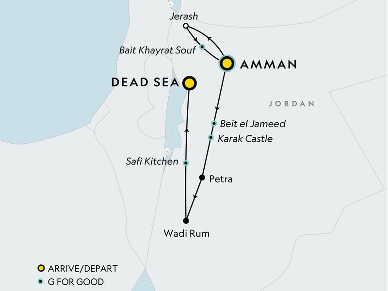 Signature Moment: Wadi Rum Stargazing, Wadi Rum. Arrival transfer. Welcome Dinner. Guided tour of Jerash archaeological site. Private post-closure visit of Amman Citadel and the Jordan Archaeological Museum. Visit Karak Castle. Petra by Night visit. Guided tour of Petra. Dinner in a private cave at Little Petra. 4x4 tour of Wadi Rum Desert. Visit the Pink Lake and Salt Beach at the Dead Sea. Bethany archaeological site and Mount Nebo visit. Farewell Dinner. Engaging Discussions with the National Geographic Expedition Expert throughout. Departure transfer. All transport between destinations and to/from included activities.