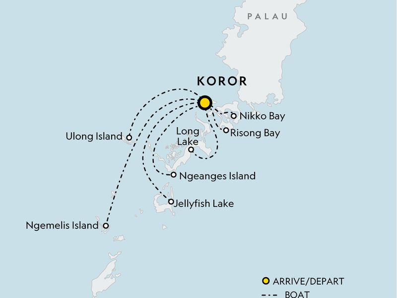 Signature Moment: Coral Reef Research Foundation Visit, Koror. Arrival and departure transfer. Nikko Bay Snorkel at Rembrandt's cove. Moana Canoe experience. Free Time at the Resort. Risong Bay kayak. Relax at Blue Devil Beach. Mandarin Fish Lake snorkel. Ulong Island Snorkel. Palawan BBQ lunch. Support the native giant clam population. Long Lake kayak. Milky Way white mud bath. Einstein's Garden snorkel. Fantasy Island and "Reef Fish Apartment House” snorkel. WWII Japanese Zero fighter plane & Rainbow Reef snorkel. Big Drop off and Fairyland Gardens snorkel. Jellyfish lake hike and snorkel. Belau National Museum Visit. Engaging Discussions with the National Geographic Expedition Expert throughout. All transport between destinations and to/from included activities.