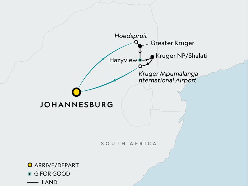 Signature Moment: Private Tour & Talk at the Nelson Mandela Foundation, Johannesburg. Arrival transfer. Internal flight from Johannesburg to Hoedspruit. Afternoon safari drive with an EWT conservationist in the Greater Kruger Area. Morning and afternoon safari drives in the Thornybush Private Game Reserve. Kruger National Park Safari Drives. Internal flight from Kruger to Johannesburg. Departure Transfer. Engaging Discussions with the National Geographic Expedition Expert throughout. All transport between destinations and to/from included activities.