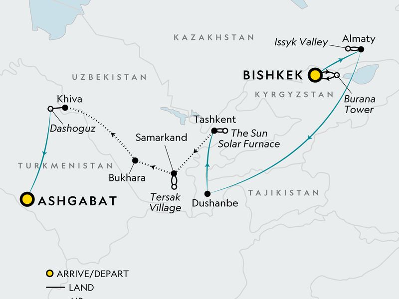 Your Local Living Moment: Plov Cooking Class and Dinner, Samarkand. Arrival and departure transfer. Bishkek City Walking Tour. Free time in Bishkek. Traditional Kyrgyz Dinner & Cultural Demonstration. Burana Tower Visit. Lunch and Village Immersion with Nomadic Traditions. Almaty City Tour. Central State Museum of the Republic of Kazakhstan. Huns Ethno Village Visit and Lunch. Free Time in Almaty. Guided City Tour of Dushanbe. Traditional Tajik Welcome Dinner. National Museum of Antiquities of Tajikistan. Historic Hissor Fortress & Madrasah. Local Family Visit & Cultural Experience. Free time in Dushanbe. Guided City Tour of Tashkent. Farewell Dinner at the TV Tower. Historic Tashkent City tour & Sacred Sites Visit. Chorsu Bazaar Visit. Rakhimov Family Art Studio Visit. Free time in Tashkent. Guided Tour of Samarkand. Architectural Wonders of Samarkand. Tersak Village Visit. Afrasiab Museum of Samarkand Visit. Guided Exploration of Bukhara's Icons. Naqshnabdi Mausoleum Visit. Sitorai Mohi-Khosa Visit. Free Time in Bukhara. Bukhara Old Town visit. Caravanserai dinner. Old Town Exploration in Khiva. Guided Tour of Khiva. Free Time in Khiva. Khorezmian Music and Dance Show. Dashoguz Local Market. Ancient Settlement of Nisa. Free Time in Ashgabat. City Tour of Ashgabat. Engaging Discussions with the National Geographic Expedition Expert throughout. All transport between destinations and to/from included activities.