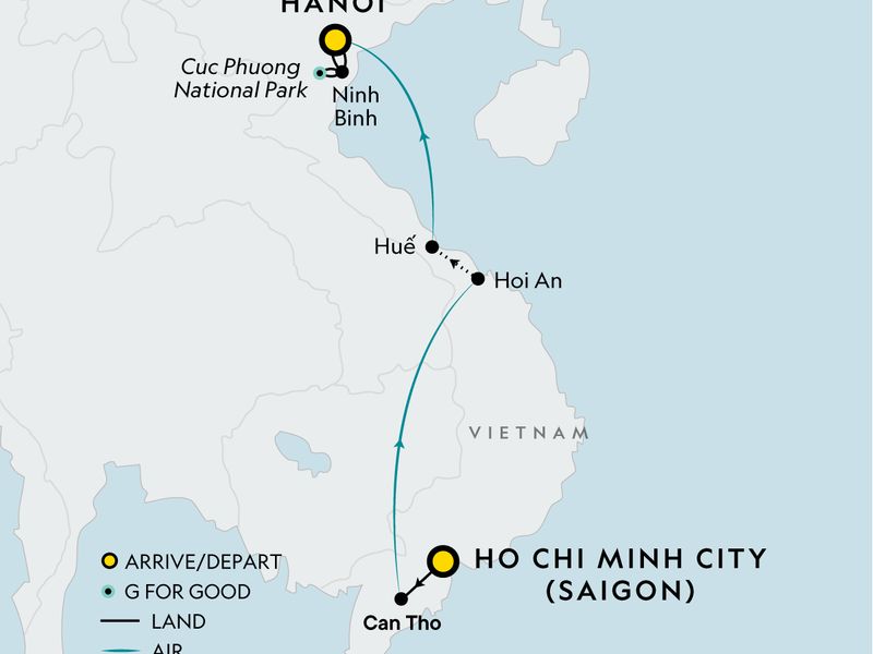 Your Foodie Moment: Hanoi Elevated Street Eats Tour, Hanoi. Arrival & departure transfer. Reunification Palace Visit. Social Impact Dining at ST25 by KOTO. Free time in Ho Chi Minh City. Walking tour of Ho Chi Minh City. Welcome Dinner at One River Restaurant. Vintage Camera Photography Experience. Cu Chi Tunnels Guided Tour. Sunrise at Cai Rang Floating Market. Free Time in Can Tho. Hoi An Guided Walking Tour and Exploration. Free Time in Hoi An. Private Dinner & Concert at Ben Xuan Garden House. Royal Tombs Visit. Hue’s Heritage by River & Citadel. Ho Chi Minh Mausoleum, Presidential Complex, and One Pillar Pagoda. Foot Massage at Dao's Care Spa Social Enterprise. Long Bien Bridge Guided Visit. Night Tour at the Temple of Literature. Van Long Wetlands Boat Trip. Session on Vietnamese Wildlife with National Geographic Grantee. Cuc Phuong Conservation Experience. Emeralda Resort Farewell dinner. Engaging Discussions with the National Geographic Expedition Expert throughout. All transport between destinations and to/from included activities.