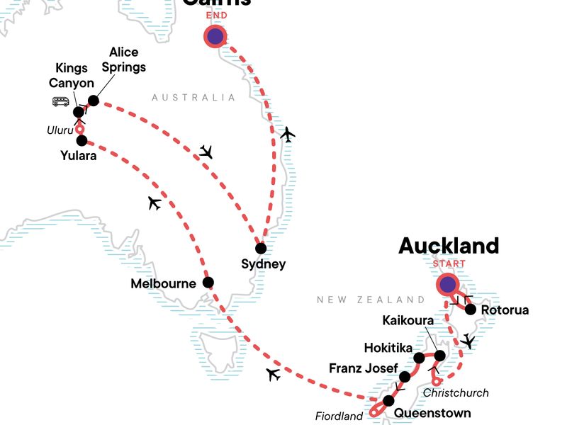 Me Day: Sydney Me Day, Sydney. Complimentary arrival transfer. Mt Eden Summit Walk. Cruise Lake Rotoiti to hot springs. Free time in Rotorua. Full day immersion with Kohutapu Lodge. Waitomo Glow Worm Caves. Visit to Kaikoura Seal Colony. Free time in Kaikoura. Hike Hokitika Gorge. Franz Glacier Trek. Free time in Franz Josef. Full Day Cruise at Doubtful Sound. Free time in Queenstown. Tour Queen Victoria Market. Laneways Street Art Tour with your CEO. Full day 4x4 excursion to French Island to spot Koalas. Guided walks at Uluru Kata Tjuta National Park. Full Service Desert Tented Camp stay in the Red Centre. Sunset at Uluru. Guided Hiking at Kings Canyon. Visit to Telegraph Station. Day trip to Manly Beach. Free time in Sydney. Kuranda Skyrail. Free time in Cairns. Internal airfare. Transport to/from all included activities.