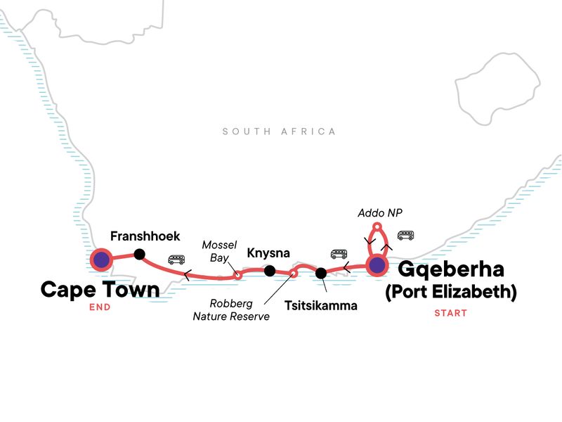 Your Welcome Moment: Welcome Moment - Meet Your CEO and Group. Addo National Park Safari drive. CEO-led hike in Tsitsikamma National Park. Big Tree Visit Tsitsikamma. Walk in Robberg Nature Reserve on the Gap Circuit. Driving and walking orientation tour of Knysna. Knysna Heads Visit. Scenic drive between Knysna and Franschhoek with stops at Mossel Bay and Barrydale. Lunch at a vineyard in Barrydale. CEO-led orientation walk of Franschhoek. Signal Hill walk. Free time in Tsitsikamma, Knysna, and Franschhoek. All transport between destinations and to/from included activities.