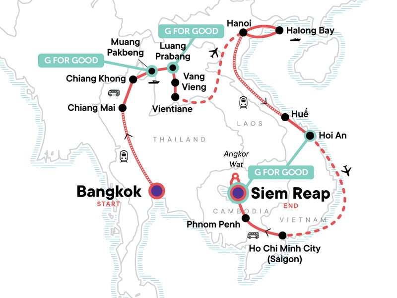 Your Discover Moment: Ho Chi Minh City. Bangkok Klong Riverboat Tour. Bangkok Wat Po Guided Tour. Doi Suthep Temple Tour (Chiang Mai). Wat Rong Khun (White Temple) Visit (Chiang Rai). Mekong River Slow Boat from Ban Houayxay to Muang Pakbèng (Laos). Dinner and traditional Khamu Cultural Performance at Mekong River Homestay in Laos. Mekong River Slow Boat from Muang Pakbèng to Luang Prabang. Pak Ou Caves guided tour. Traditional Arts & Ethnology Museum guided tour (Luang Prabang). Ock Pop Tok Living Crafts Centre. Lunch with the local Baan Ou Community. Kuang Si waterfalls trek (half-day). Old Quarter Orientation Walk (Hanoi). Water puppets performance (Hanoi). Ho Chi Minh Mausoleum and Museum Visit (when open). Halong Bay caves entrance. Halong Bay boat cruise with seafood lunch and dinner. Overnight train from Hanoi to Hue. Thien Mu Pagoda Visit. Imperial Citadel and Tomb entrance (Huế). Noodle making demonstration and lunch at Oodles of Noodles (Hoian). Cu Chi Tunnels entrance and tour. Phnom Penh city tour on Cyclo. Tuol Sleng prison and Choeung Ek (Killing Fields) entrance and guide. Two-day Angkor Wat complex entry and guide. Angkor Wat sunrise tour. Internal flights. All transport between destinations and to/from included activities.
