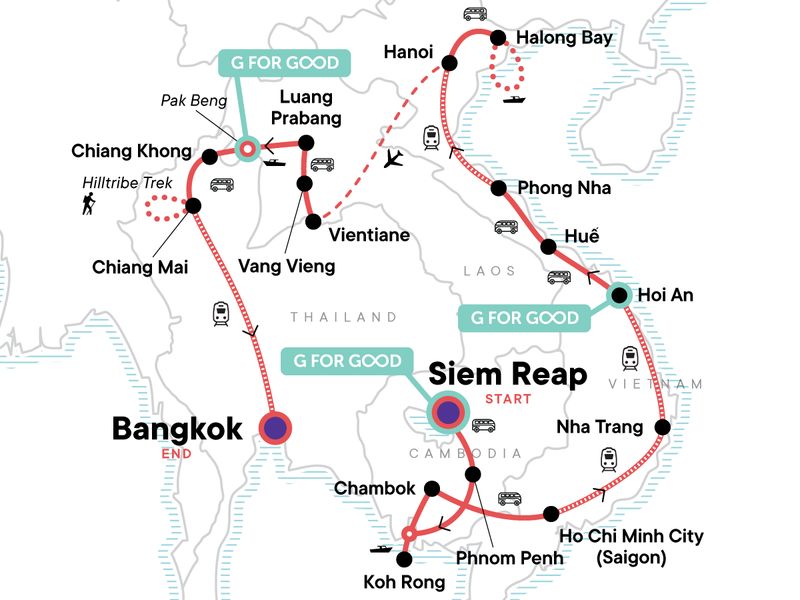 Your Discover Moment: Chiang Mai. Guided sunrise tour of Angkor Wat temple complex. Traditional meal at the G Adventures-supported New Hope project or in a local home in a nearby village. Local living moment at Chambok Homestay including dinner. Orientation walks in Phnom Penh, Ho Chi Minh City, Hoi An, Hanoi, and Luang Prabang. Street food crawl in Phnom Penh, Nha Trang, Luang Prabang. Noodle-making demonstration and lunch at Oodles of Noodles (Hoi An). Halong Bay boat cruise with lunch. Hilltribe trek in Northern Thailand, including bamboo rafting. All transport between destinations and to/from included activities.