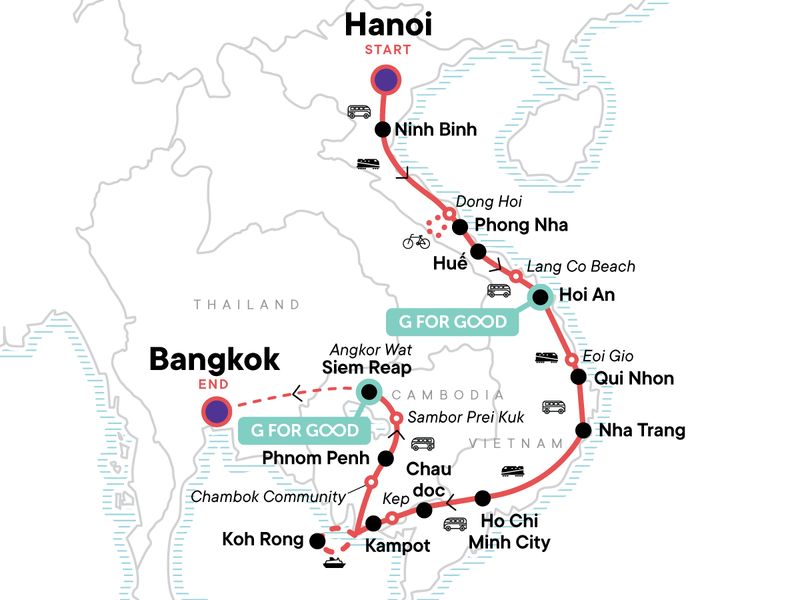 Your Foodie Moment: Street Food Dinner in Chinatown, Bangkok. Hanoi Old Town Cyclo Tour. Bia Hoi Corner and Microbrewery Crawl. Hanoi Foodie Culture Tour. Tam Chuc Pagoda Tour. Dong Hoi Wet/Fish Market tour and countryside cycling. Vinh Moc Tunnels Tour. An Bang Cemetery Tour. Visit Lang Co Beach. Hai Van Pass and Marble Mountain Tour. Hoi An Old Town Walk and Riverside Evening Out. Dinner at one of the stylish restaurants in the ancient town of Hoi An. Thap Doi Cham Temples Visit. Eoi Gio Coastal Walk. Beach Time at Qui Nhon and Nha Trang. Visit Gành Đá Dĩa. Ho Chi Minh City Walking Tour including Ben Thanh Market. Karaoke Night. Motorbike tour including Hang Pagoda and Sam Mountain. Chau Doc market. Kep market walk. Tour of Monivong Bokor NP. Tour of Chambok Community with traditional lunch. Phnom Penh cyclo tour and dinner at one of best restaurants in Phnom Penh. Visits to Skun Market and Santuk Silk Farm. Tour of Sambor Prei Kuk Ancient Site. Visit Rong Klua Market. Visit Wat Sothorn Wararam Woraviharn. Walk and night out on Khao San Road. All transport between destinations and to/from included activities.