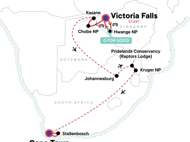 Seventeen days. Four countries. Endless moments you’ll never forget. From the roar of Victoria Falls to the stillness of the savannah at sunrise, this journey blends iconic wildlife encounters with extraordinary cultural experiences and a touch of indulgence at every turn. Track elephants and lions with expert guides in Botswana and Zimbabwe, cruise the Chobe River as hippos surface all around you, and share stories with local communities who open their homes and hearts. Then, slow the pace with e-bike rides through Stellenbosch vineyards and coastal adventures along the Cape Peninsula. It’s Southern Africa at its finest — wild, soulful, and elevated in every way.