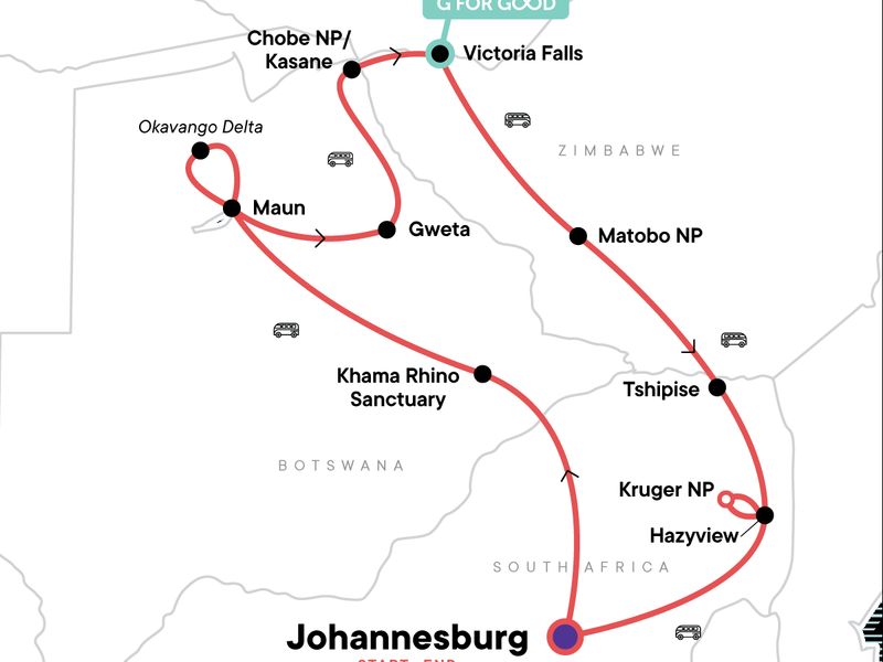 Your Discover Moment: Victoria Falls. Khama Rhino Sanctuary Drive. Okavango Delta overnight bush camping excursion. Guided walk and open vehicle safari drive in Matobo NP. Kruger NP entrance with wildlife safari drives in the Lando. Traditional dinner and local dancing. All transport between destinations and to/from included activities.