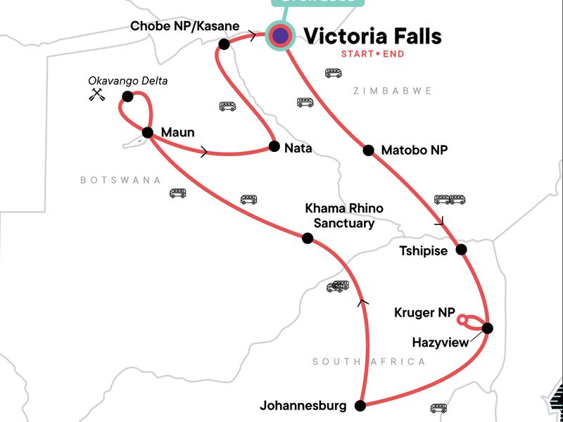 Now's the time to explore Africa on your terms with this tour that's affordable for young travellers. Wildlife, wilderness, and wow-worthy camp outs make up this 15-day exploration of South Africa, Botswana, and Zimbabwe. Hop aboard one of our Landos (overland adventure vehicle) and go searching for the "big five" in Kruger National Park, check out Victoria Falls, and look for rhinos on-foot in Matobo National Park. Don’t let anything extra get between you and the expansive scenery – camp out, sing songs around the fire with locals, and travel by mokoro canoe. When you're down here, the more time spent outside, the better.