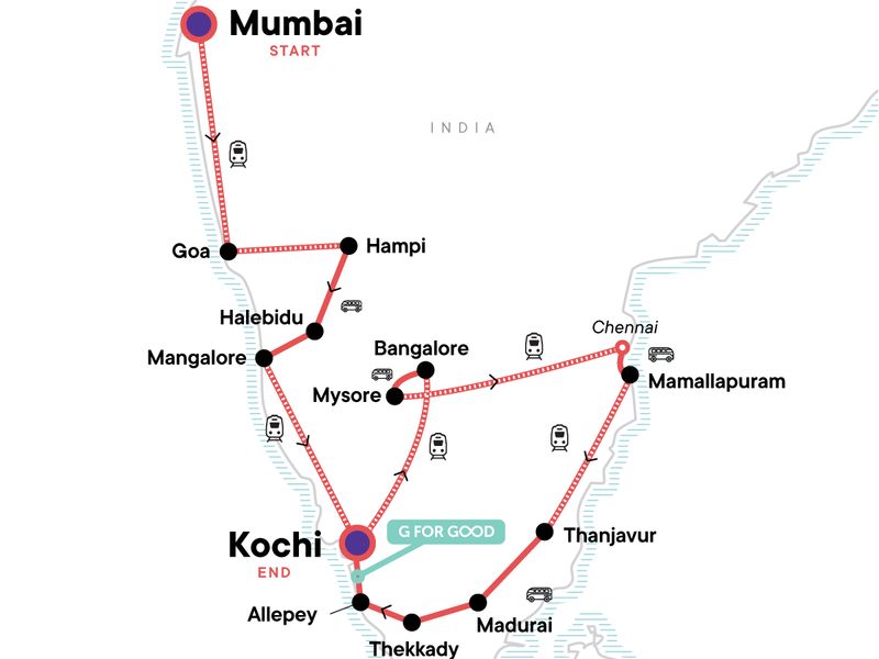 Your Local Living Moment: Kerala Backwaters Homestay, Alleppey. Colaba Sunrise Walk. Guided exploration of Elephanta Caves. Heritage walk of Fontainhas (Portuguese quarter). Visit to Old Goa churches. Sunset visit and exploration of Hampi ruins. Guided exploration of Halebidu ruins. Hoysaleshwara Temple. Scenic train journeys: Mumbai → Goa, Goa → Hampi, Mangalore → Kochi. Fort Kochi Visit. Free Time in Kochi. Lal Bagh Gardens Visit. Free Time Bangalore. Bangalore Orientation Walk. Sri Ranganatha Swamy Temple Visit. Tomb of Tipu Sultan. Devraja Market Visit and Orientation Walk. Chamundi Hills Visit. Mysore Palace Visit. St. Philomena's Cathedral Visit. Mysore Free time. Free time in Mamallapuram. Sunrise Shore Temple Visit. Brihadeeswara Temple. Bronze Casting Workshops. Chettinad Traditional House Visit. Thirumalai Nayak Palace Visit. Meenakshi Temple Visit. Cycle-Rickshaw Tour. Cardamom Hills Spice Plantation Tour. Free Time in Thekkady. Boat through Kerala Backwaters. Kerala Backwaters Homestay. Lunch at Theruvarom Women Empowerment Project. Orientation Walk in Kochi. Kathakali Dance.
