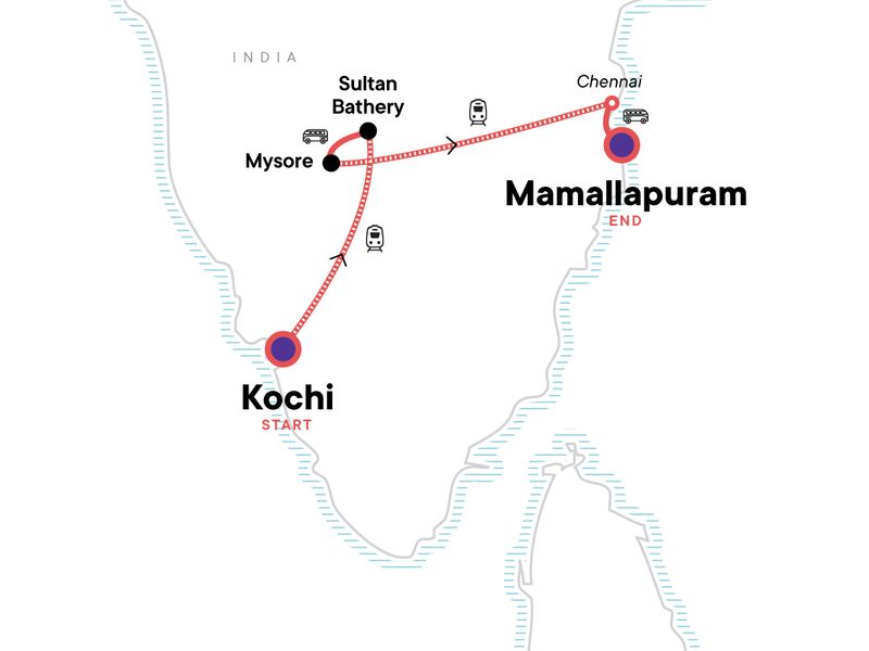 South India is a feast for the senses — and this journey serves up the very best. Drift through Kochi’s backwaters, where spice-scented streets reveal centuries of history. Wander royal halls in Mysore, lose yourself in the buzz of colourful markets, and follow the coastline to Mamallapuram’s sculpted temples that glow at sunset. Add in the beautiful and historic Sultan Bathery's countryside, and you’ve got an adventure that blends history, culture, and just the right amount of coastal calm.