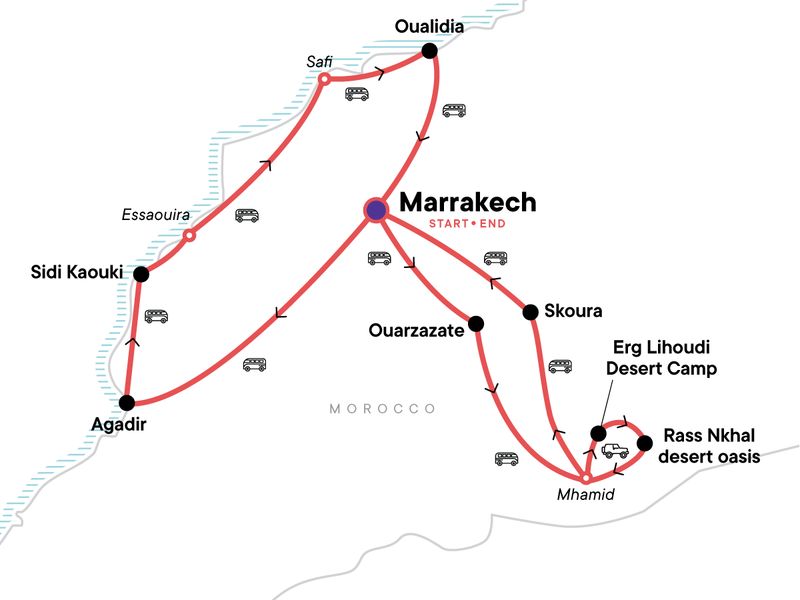 Your Foodie Moment: Local Lunch and Traditional Cooking Demonstration, Sidi Kaouki. Visit to the Souk Lhad market. Tamri Beach Sandboarding. Bread making and lunch with a local family. Visit to Essaouira. A stop at Safi old town and pottery market. Free time in Oualidia and Marrakech, Cooking class in Marrakech. Food tasting in the medina. Tea on terrace overlooking Jemaa El Fnaa. Visit to Jardin Secret or Bahia Palace and Ben Yousset Medressa. Local bakery stop for some moroccan bread. Tanjia pots lunch. Visit to Ouzoud, an oasis waterfall. Dinner in Jamaa Fnaa Square food stall. Film Studio visit in Ouarzazate. Welcome Tea and bonfire at Erg Lihoudi desert camp. A camel ride and 4x4 jeep excursion to desert oasis camp. All transport between destinations and to/from included activities.