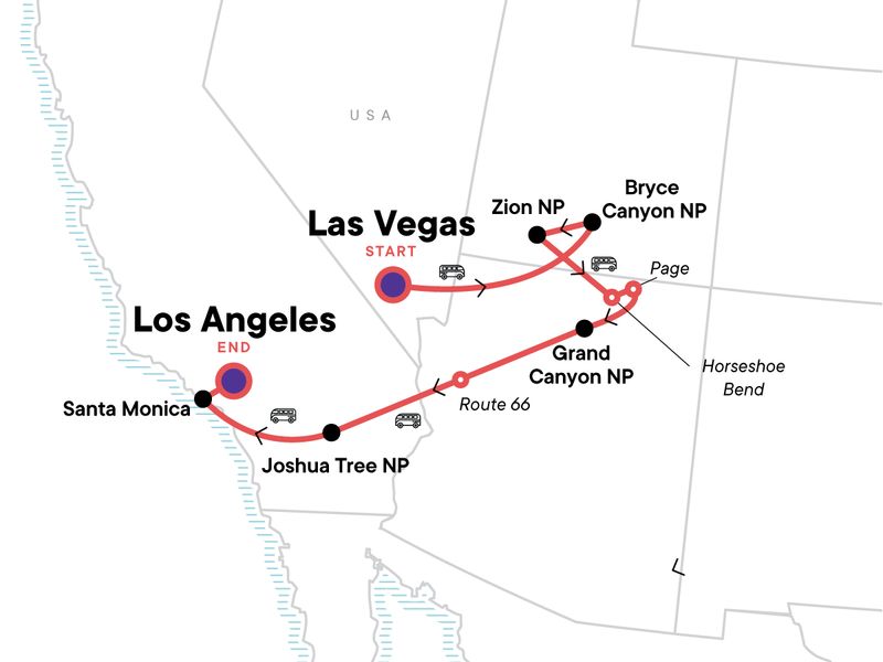 Your Welcome Moment: Welcome Moment - Meet Your CEO and Group. Bryce Canyon National Park Visit. Zion National Park Visit. Horseshoe Bend Hike. Grand Canyon South Rim Visit. Visit Route 66. Joshua Tree National Park Visit. Free time in Santa Monica. All transport between destinations and to/from included activities.