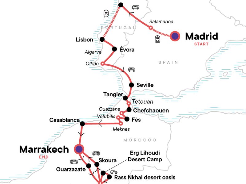Craving rich history, vibrant culture, and mouthwatering flavours? This 22-day adventure through Spain, Portugal, and Morocco delivers it all — and then some. Start in Madrid before heading to Porto to sip its famous port wine, then journey south along Portugal’s stunning coastline, where Fado music and Flamenco performances set the scene. Cross the Strait of Gibraltar and step into a whole new world in Morocco — wander the bustling medinas, explore the striking Blue City, hike the Rif Mountains, and take in the breathtaking beauty of the Sahara. A perfect mix of past and present, tradition and adventure, this journey is a feast for the senses that’ll leave you wanting more.