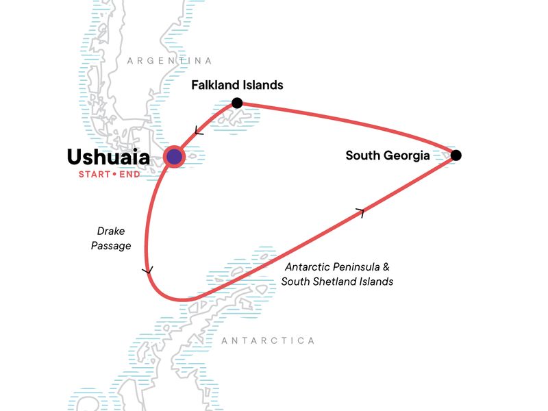 Meet hardy locals and spot unique wildlife in the Falkland Islands, Explore abandoned whaling stations and visit Shackleton’s grave, Walk quietly amongst king penguins and watch them surf onto the beach, Learn about the environment and ecology from industry experts, Spot whales and seals while cruising past icebergs aboard Zodiacs, Set foot on the continent of Antarctica