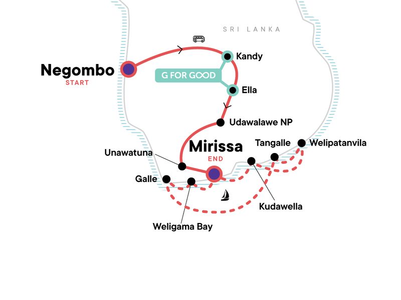 Your Welcome Moment: Welcome Moment - Meet Your CEO and Group. Spice plantation visit. Kandyan cultural dance performance. Temple of the Tooth visit. Tea plantation visit and tasting (AMBA). Cooking demonstration. BBQ and camp at Udawalawe NP. Galle City and Fort tour. Sailing Sri Lanka's south coast. Visits to Weligama Bay and Galle. Watching for whales and dolphins from the boat. Beach BBQ. Snorkelling, kayaking and stand up paddle boarding equipment. All transport between destinations and to/from included activities.