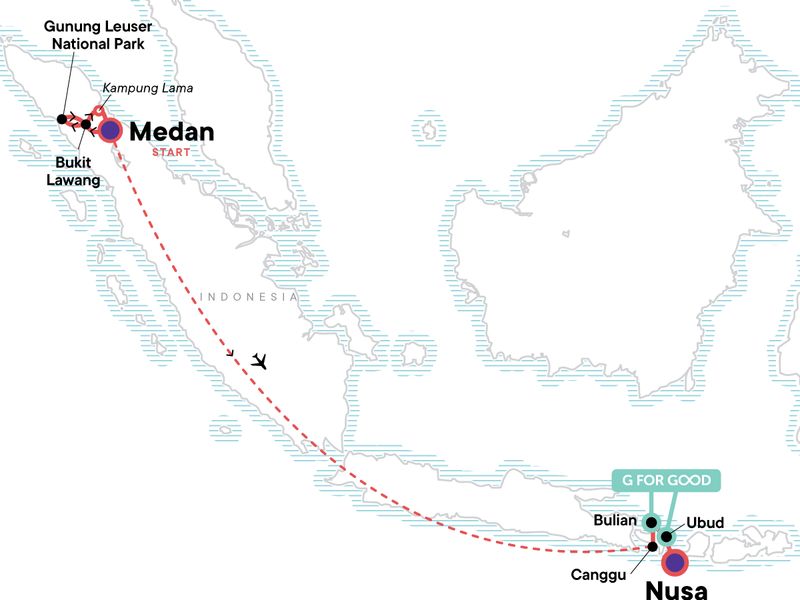 Your Discover Moment: Ubud. Guided Medan city tour with Becak. Epic jungle trek in search for orangutan. Camping inside Gunung Leuser National Park. River tubing. Kampung Lama cultural immersion experience. 2-hour surf lesson in Canggu. Ulun Danu Temple. Bulian Village Tour with local guide. Camping in Kintamani. Mt Batur sunrise hike + hot spring soaks. Seaweed farm tours. Devil’s Tear cliffs. Beaches of Nusa Lembongan. All transport between destinations and to/from included activities.